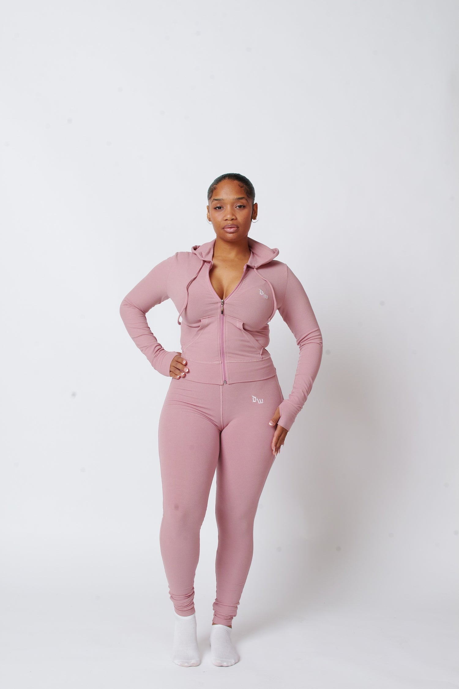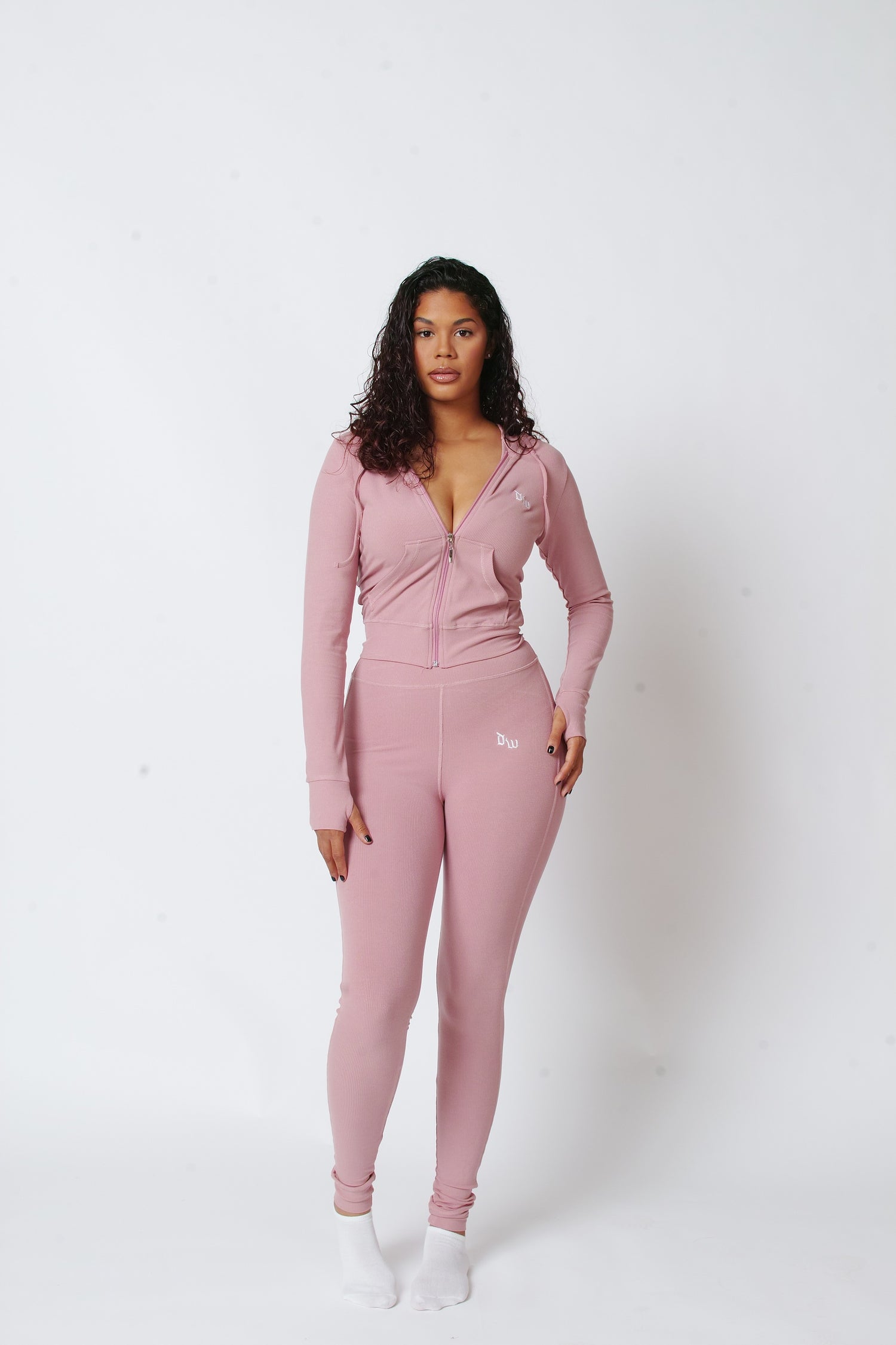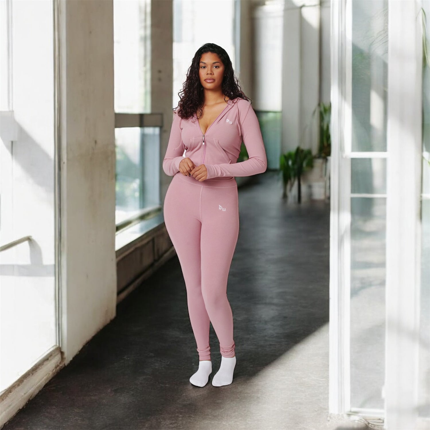 DW ribbed loungewear sets are simple but they also scream out comfy and stylish. This set would be a great addition to your everyday wardrobe. Featuring body shaping leggings, rounded neckline hoodie Long sleeve jacket, embroidery DW logo.